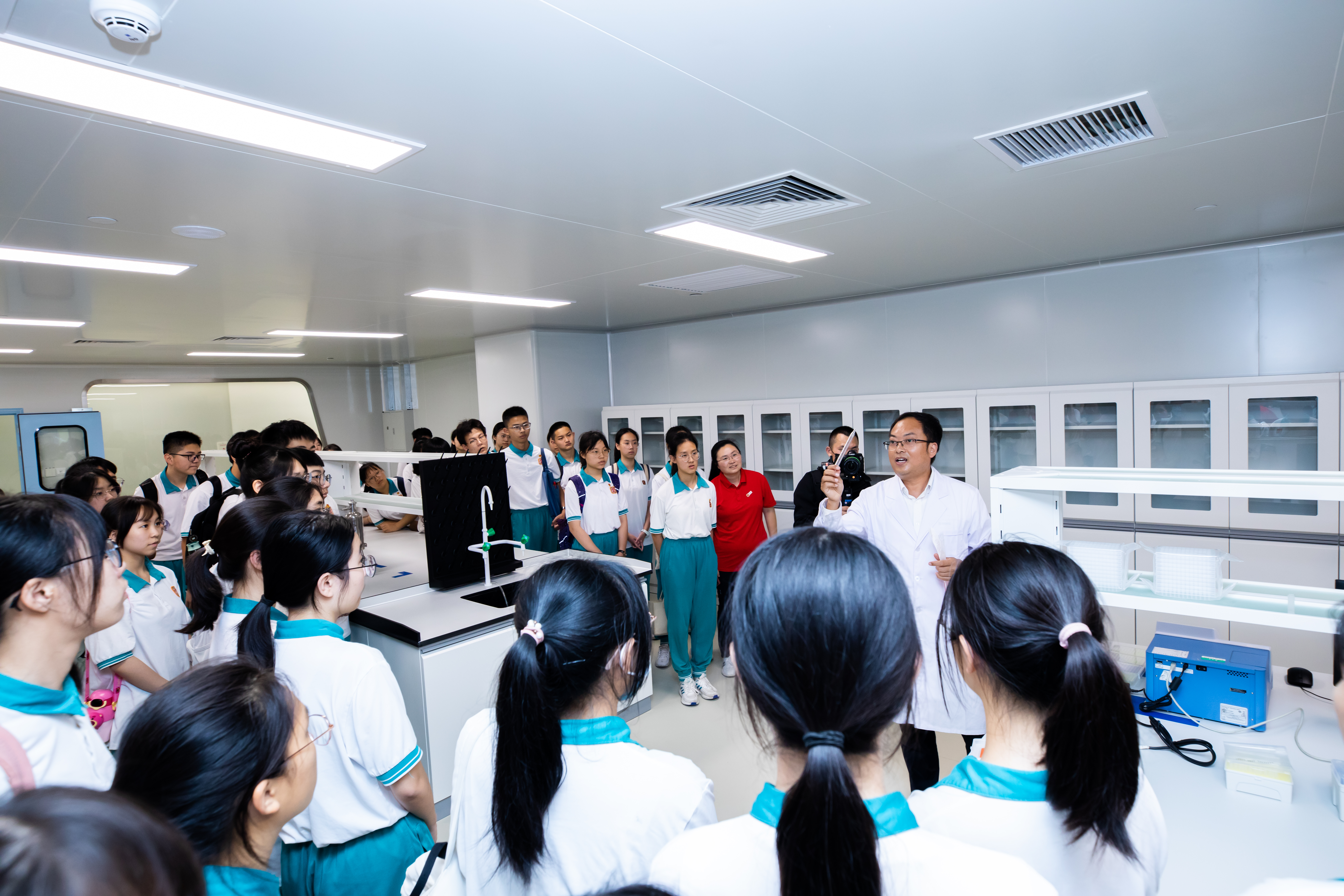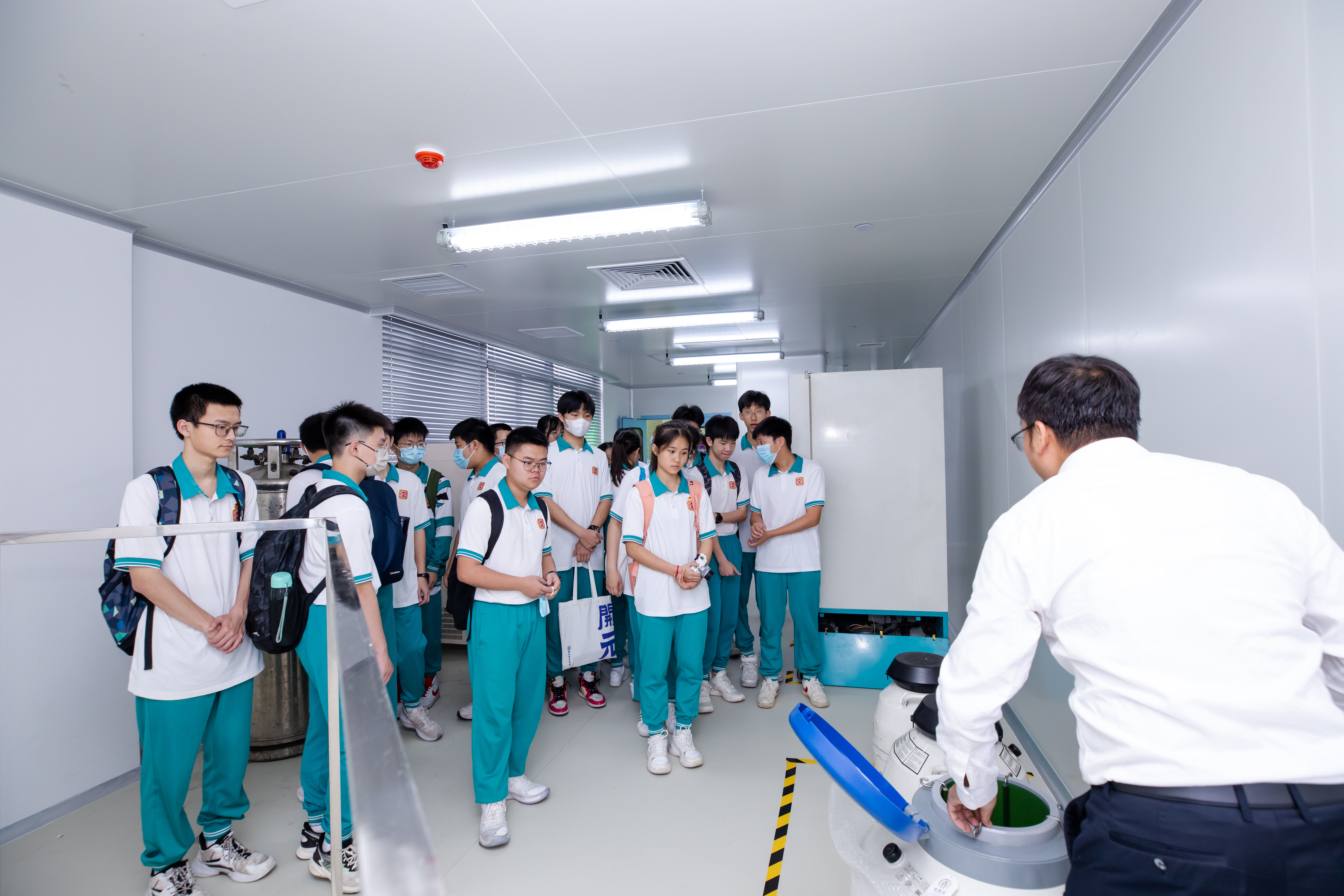 此次研學(xué)之旅,廣州開元學(xué)校師生不僅參觀了潔特生物的沉浸式生命科學(xué)體驗廳,還前往生產(chǎn)一線了解潔特生物最先進的無人工廠與智能化設(shè)備。同時,他們還來到潔特檢測中心,通過高精密的儀器設(shè)備與細胞零距離“見面”。