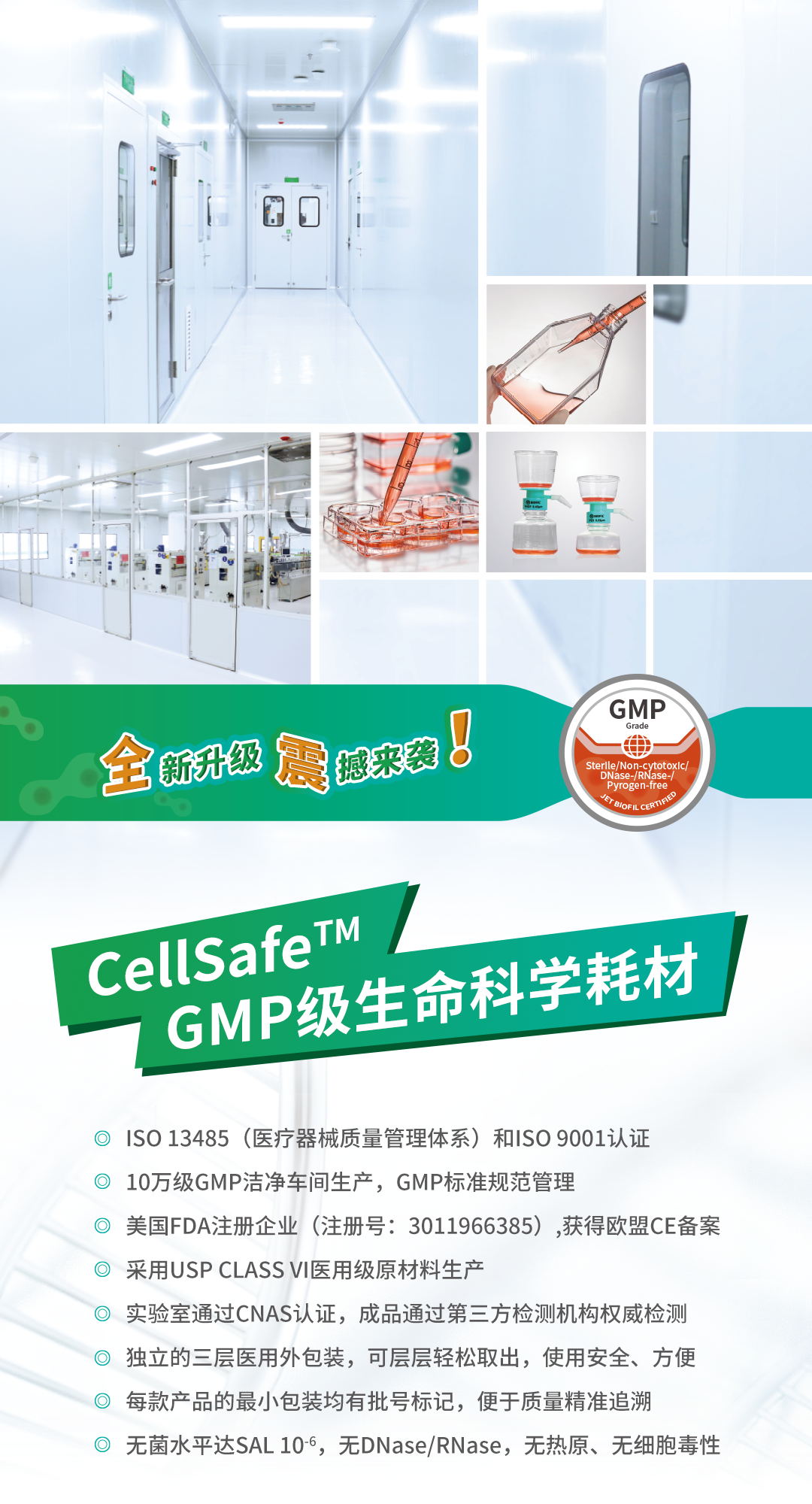 潔特生物GMP級(jí)生命科學(xué)耗材——CellSafe™系列產(chǎn)品全新升級(jí)、重磅來(lái)襲,該系列產(chǎn)品按照GMP質(zhì)量標(biāo)準(zhǔn)要求生產(chǎn),高潔凈度、高安全性,可滿(mǎn)足細(xì)胞治療、基因治療、抗體、疫苗等生物制藥企業(yè)及其他潔凈實(shí)驗(yàn)室對(duì)生物實(shí)驗(yàn)耗材有更高潔凈等級(jí)要求的標(biāo)準(zhǔn)化制造與規(guī)模化生產(chǎn)。