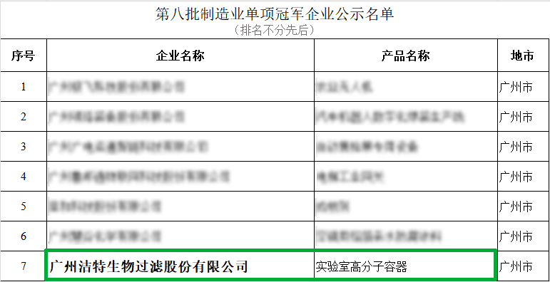 近日,廣東省工業(yè)和信息化廳發(fā)布了《第八批全國制造業(yè)單項(xiàng)冠軍企業(yè)》名單,廣州潔特生物過濾股份有限公司憑借生物實(shí)驗(yàn)室耗材關(guān)鍵核心技術(shù)和先進(jìn)生產(chǎn)工藝創(chuàng)新研發(fā)能力以及遙遙領(lǐng)先的市場占有率榮獲“制造業(yè)單項(xiàng)冠軍”。