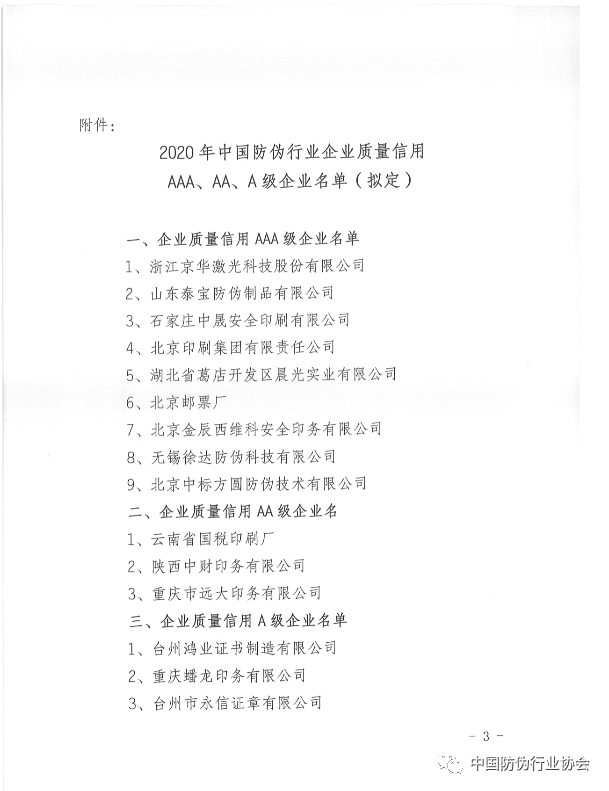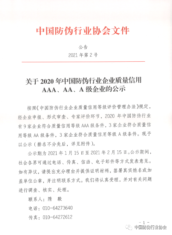 關(guān)于2020年中國(guó)防偽行業(yè)企業(yè)質(zhì)量信用AAA、AA、A級(jí)企業(yè)的公示